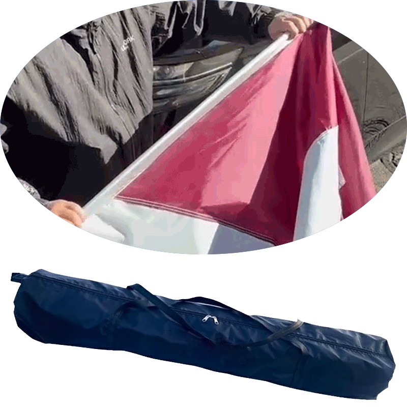 フロント、バックそれぞれの端に入っている長いバーを使い、一人でも簡単に素早く脱着可能! 付属の収納袋に収めれば、コンパクトにまとまります。
