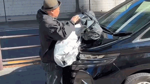 袋から取り出したカバーをボンネットに置き、ナンバープレートに引っ掛ける